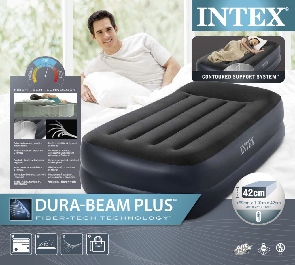 Intex krevet na napuhavanje Twin Dura Beam Plus Pillow Rest 64122NP je udoban krevet koji nudi praktičnost i udobnost za kućnu ili vanjsku upotrebu. Ovaj model pripada seriji Dura-Beam Plus i koristi inovativnu Fiber Tech™ tehnologiju, koja mu daje čvrstu strukturu i potporu za leđa.